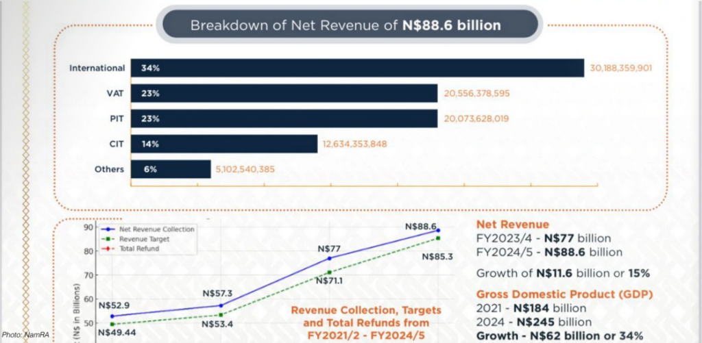 The Namibia Revenue Agency (NamRA) has surpassed its revenue target for the financial year FY2024/5, collecting a net total of N$88.6 billion to beat the target of N$85.3 billion.