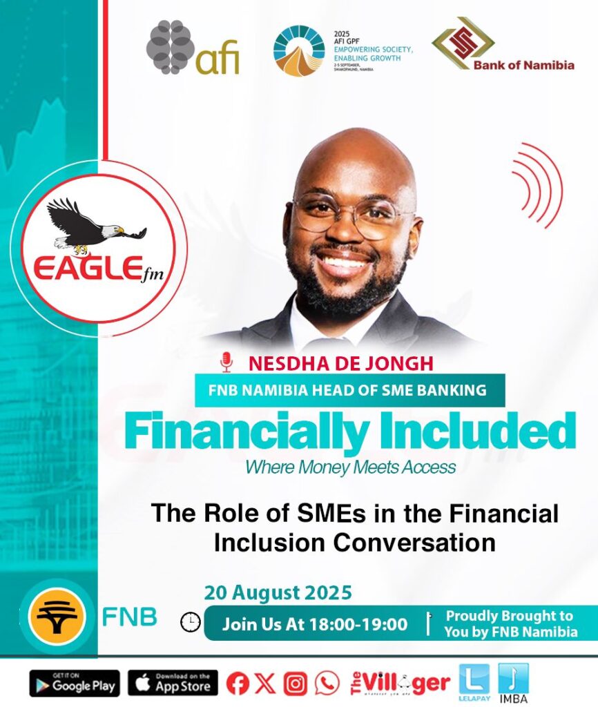 FNB FINANCIALLY INCLUDED WITH HEE-DEE (20 AUGUST 2025) Financially Included 20th August 2025 / EAGLE FM On this edition of Financially Included, we engaged with FNB Namibia Head of SME Banking, Nesdha De Jongh, about the role that the SME sector plays in the financial inclusion conversation.