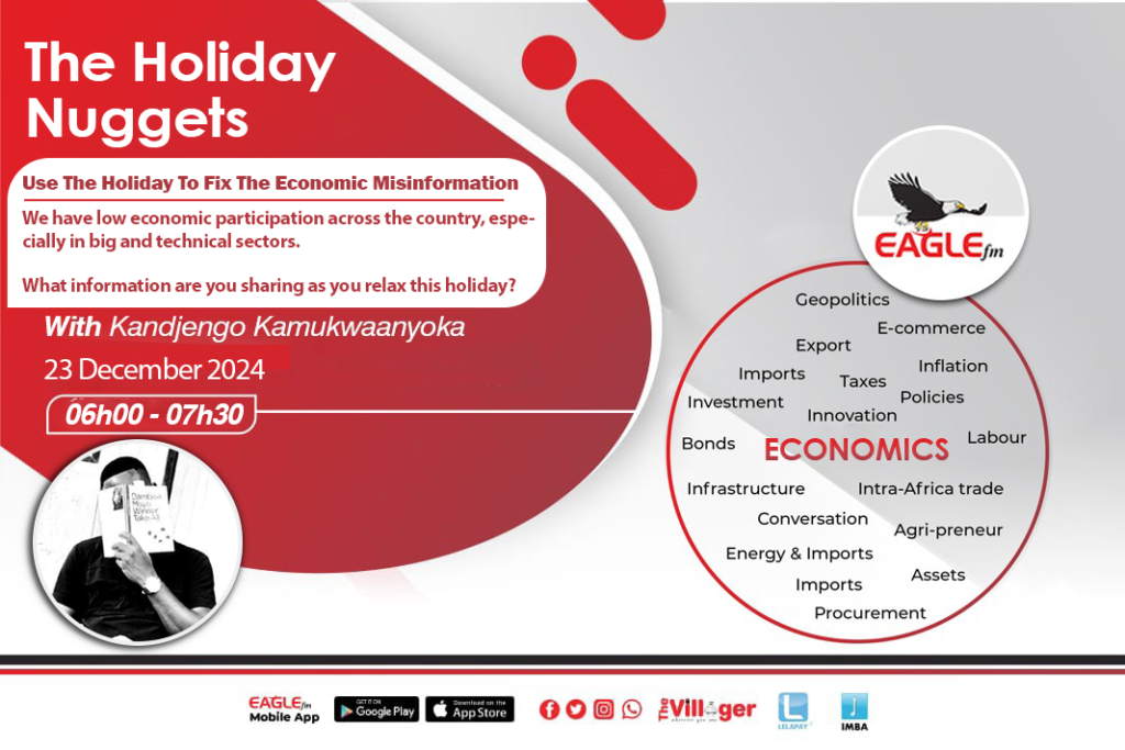HOLIDAY NUGGETS WITH KANDJENGO (23 DECEMBER 2024) 23rd December 2024 / EAGLE FM Use The Holiday To Fix The Economic Misinformation We have low economic participation across the country, especially in big and technical sectors. What information are you sharing as you relax this holiday?