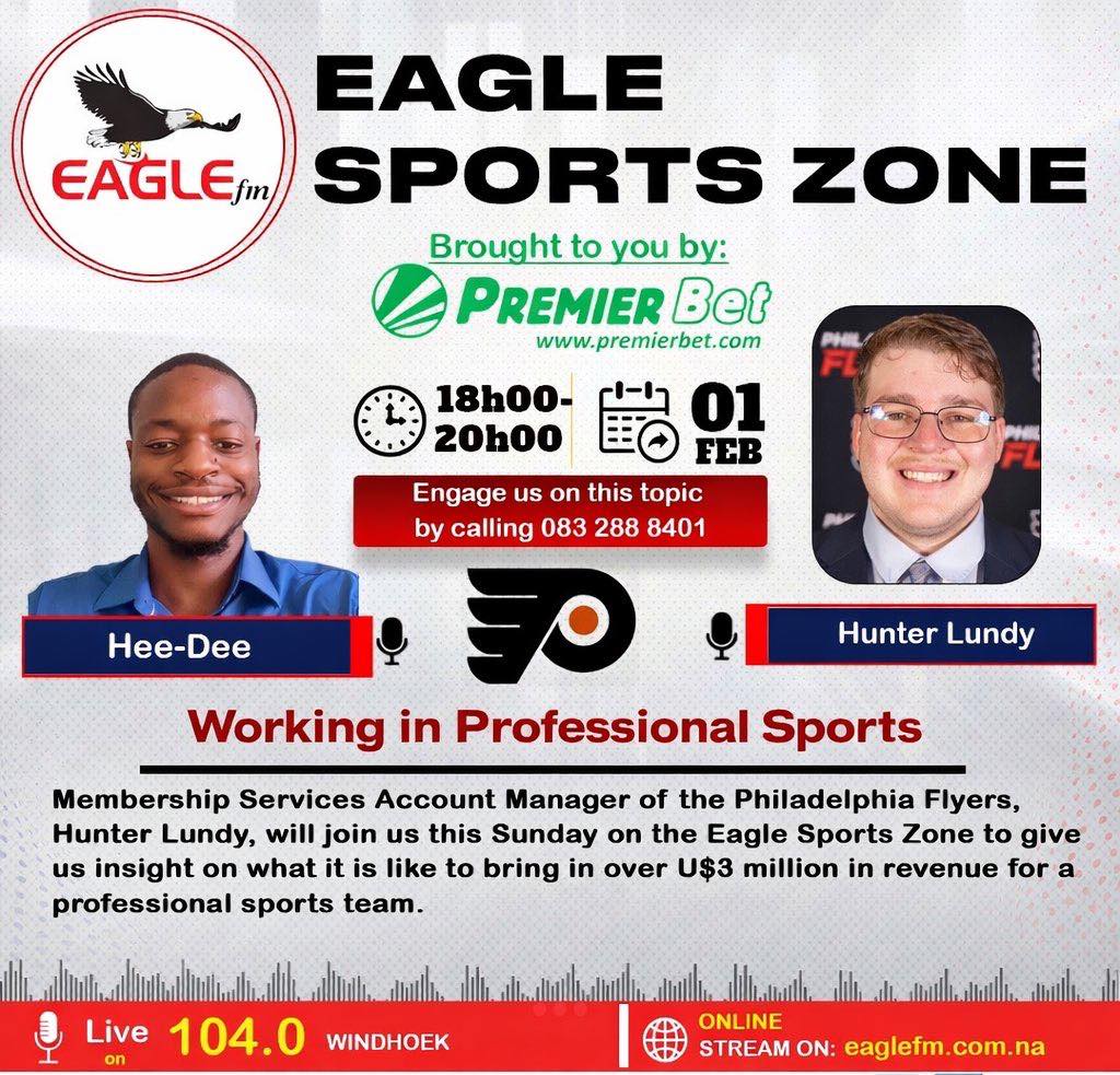 Membership Services Account Manager of the Philadelphia Flyers, Hunter Lundy, will join us this Sunday on the Eagle Sports Zone to give us insight on what it is like to bring in over U$3 million in revenue for a professional sports team.