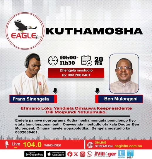 Efimano Loku Yandjela Omauwa Keepresidente Dili Moipundi Yetulumuko. Endela pamwe noprograma Kuthamosha mongula pomulongo fiyo etata lomulongonambali. Omweenda mostudio ota kala Doctor Ben Mulongeni, Omunamayele wopapolotika.
