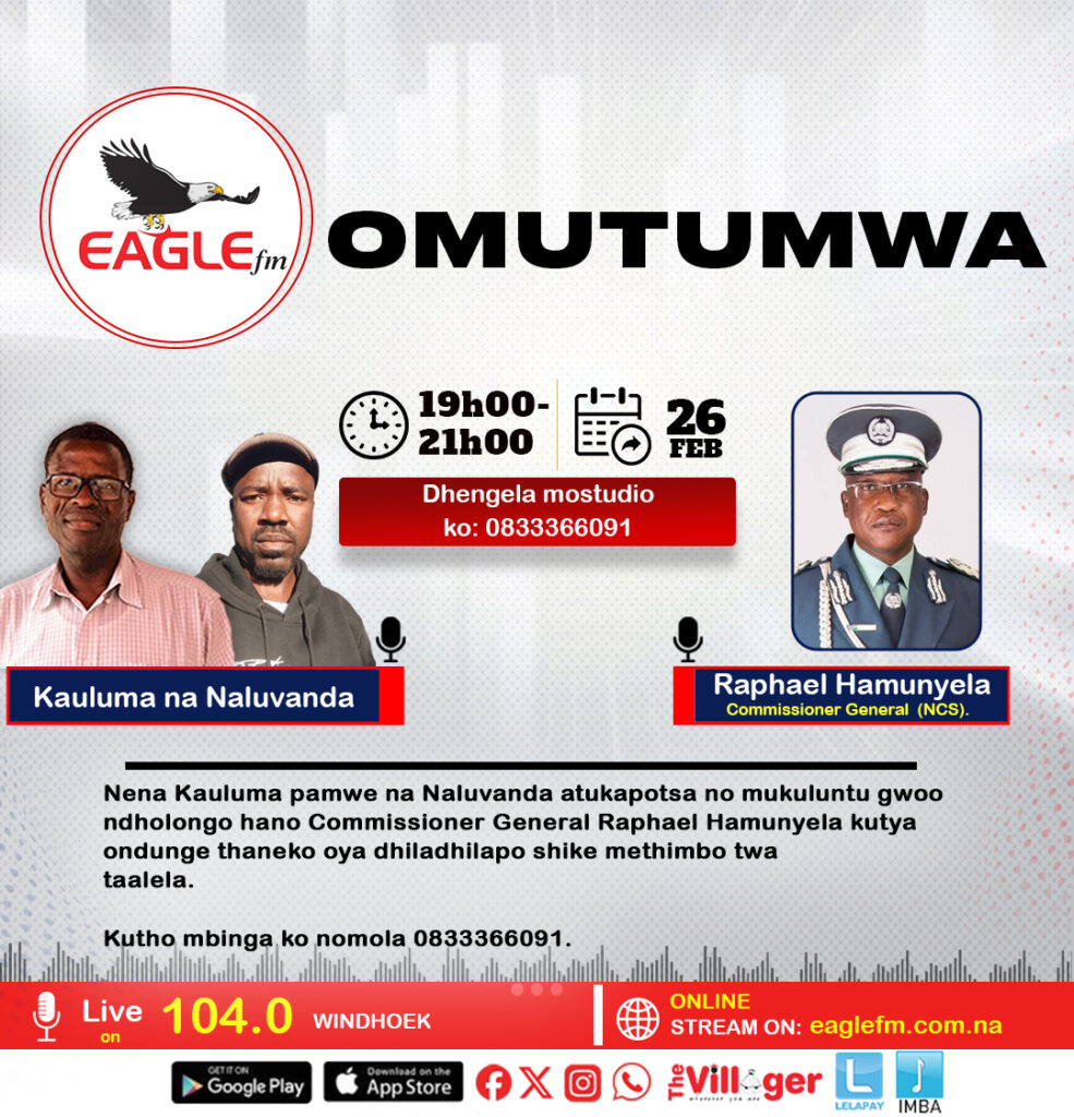 OMUTUMWA PAMWE NA KAULUMA NA NALUVANDA (26 FEBRUARY 2026) 26th February 2026 / EAGLE FM Nena Kauluma pamwe na Naluvanda atukapotsa no mukuluntu gwoo ndholongo hano Commotioner General Raphael Hamunyela kutya ondunge thaneko oya dhiladhilapo shike methimbo twa taalela.