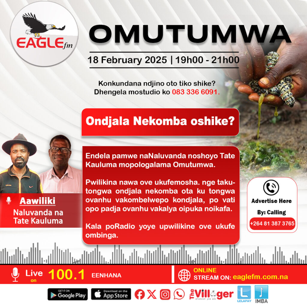OMUTUMWA PAMWE NA KAULUMA NA NALUVANDA (8 FEBRUARY 2025) 18th February 2025 / EAGLE FM Ondjala Nekomba oshike? Endela pamwe naNaluvanda noshoyo Tate Kauluma mopologalama Omutumwa. Nge takutongwa ondjala nekomba ota ku tongwa ovanhu vakombelwepo kondjala, po vati opo padja ovanhu vakalya oipuka noikafa.
