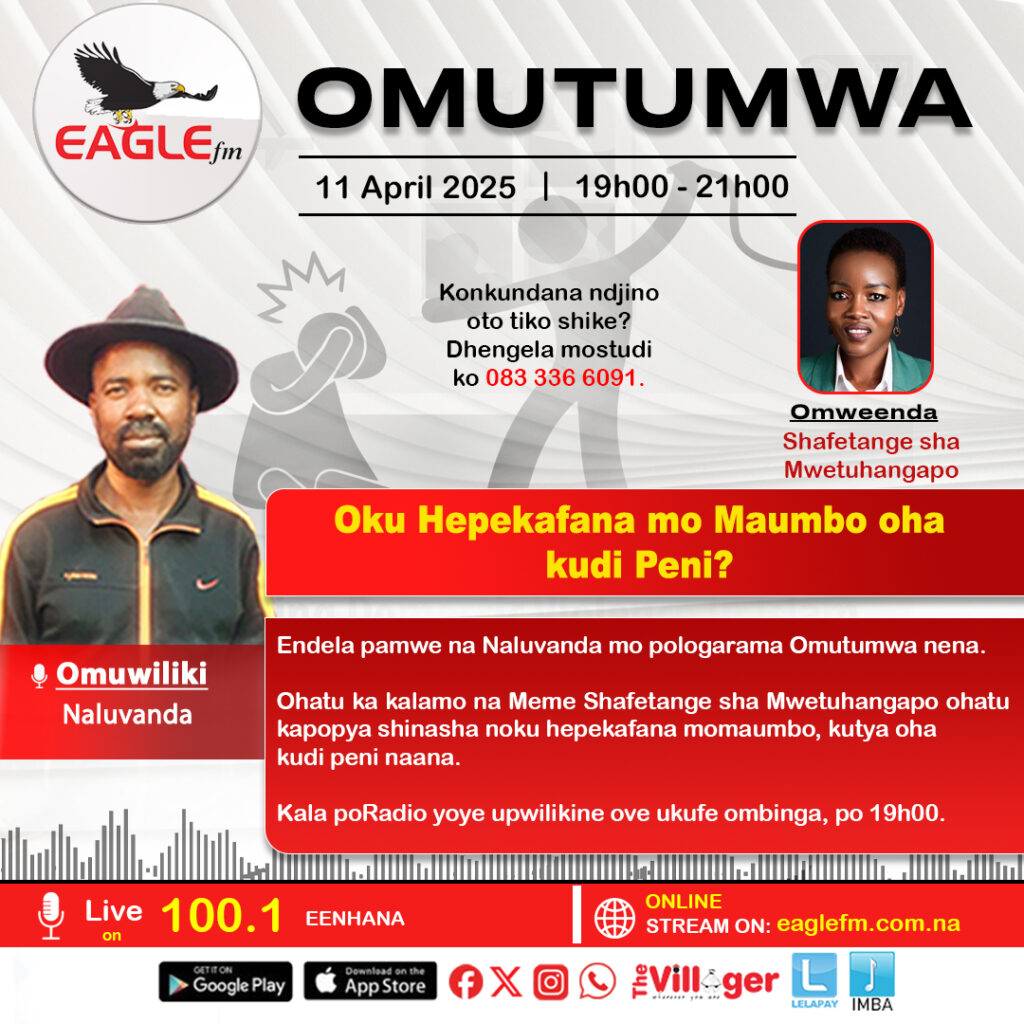 OMUTUMWA PAMWE NA NALUVANDA (11 APRIL 2025) 11th April 2025 / EAGLE FM Oku Hepekafana mo Maumbo oha kudi Peni? Endela pamwe Naluvanda mo pologarama Omutumwa nena. Ohatu ka kalamo na Meme Shafetange sha Mwetuhangapo ohatu kapopya shinasha noku hepekafana momaumbo, kutya oha kudipeni naana.