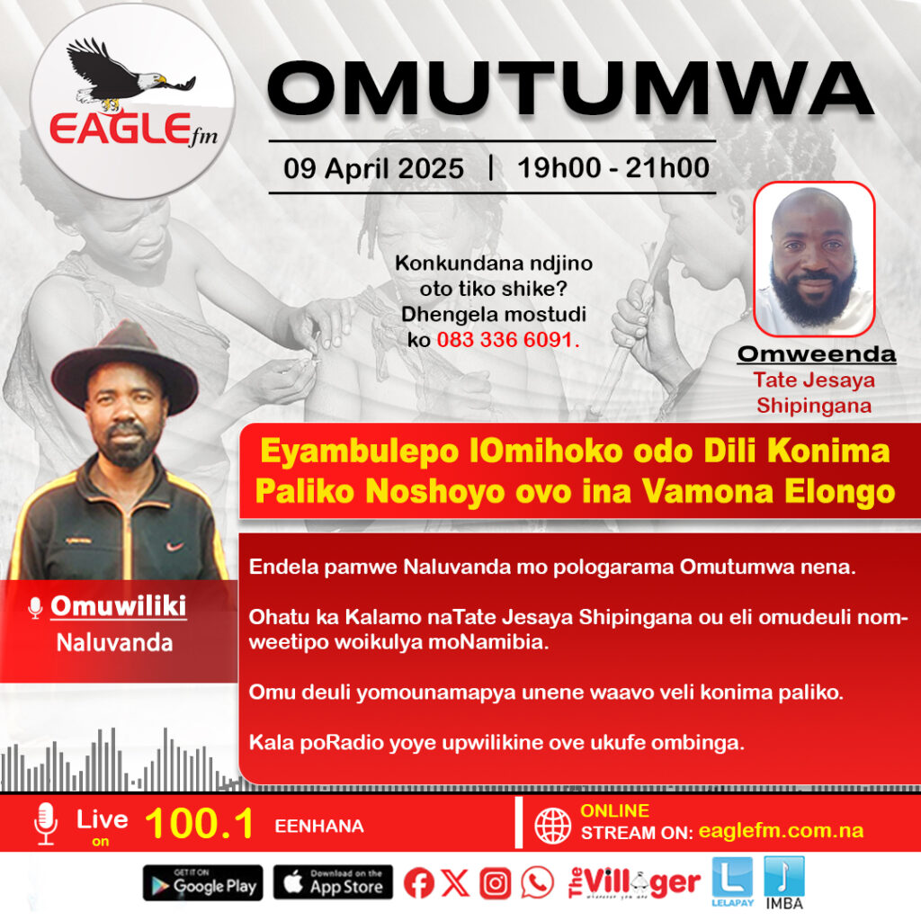OMUTUMWA PAMWE NA NALUVANDA (9 APRIL 2025) 9th April 2025 / EAGLE FM Eyambulepo lOmihoko odo Dili Konima Paliko Noshoyo ovo ina Vamona Elongo Endela pamwe Naluvanda mo pologarama Omutumwa nena. Ohatu ka Kalamo naTate Jesaya Shipingana ou eli omudeuli nomweetipo woikulya moNamibia.