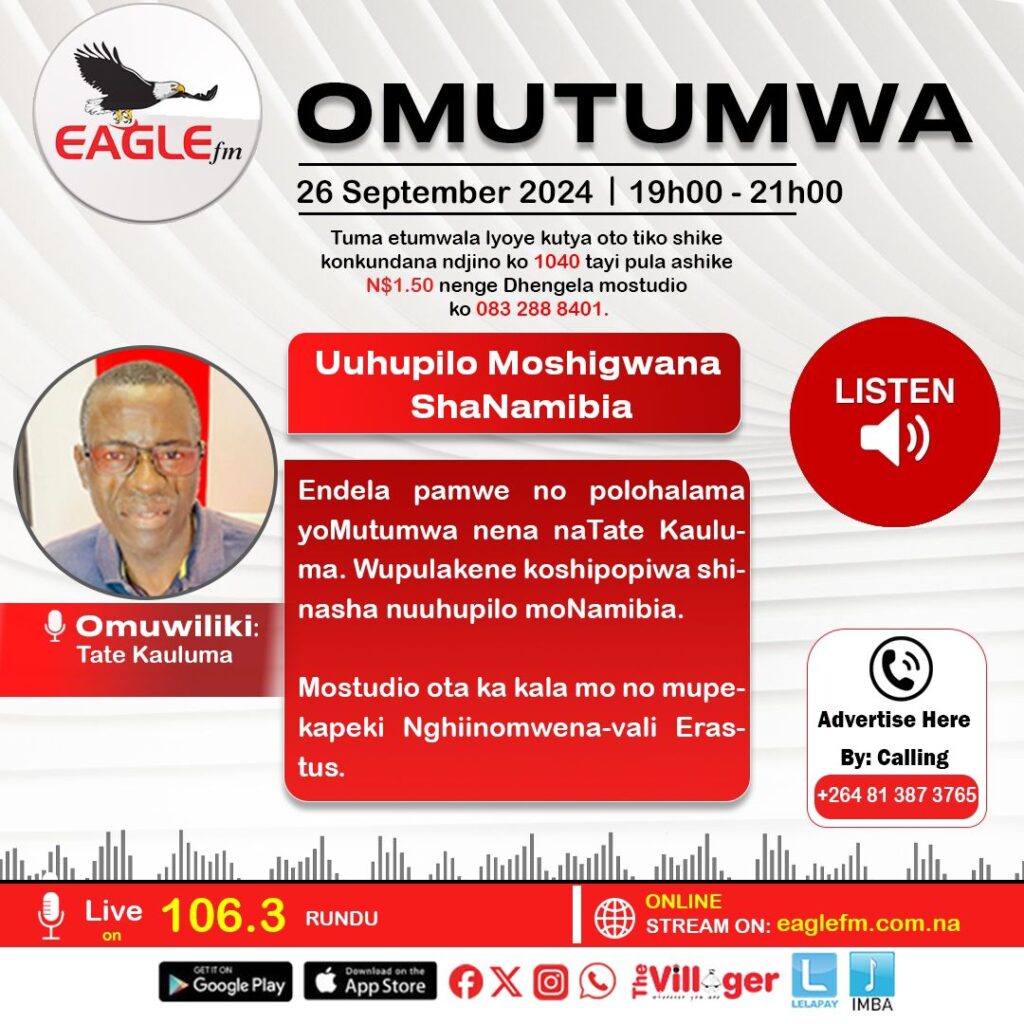 OMUTUMWA PAMWE NA NATANGWE NA MATHIAS (26 SEPTEMBER 2024) 26th September 2024 / Eagle FM Uuhupilo Moshigwana ShaNamibia Endela pamwe no polohalama yoMutumwa nena naTate Kauluma. Wupulakene koshipopiwa shinasha nuuhupilo moNamibia. Mostudio ota ka kala mo no mupekapeki Nghiinomwena-vali Erastus.