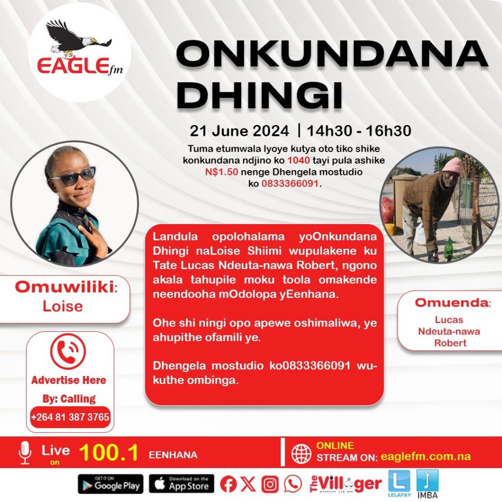 1.Oradio yetu your Eagle Fm otwali twa tala ko miyalu dhaatalelipo yatalelepo oshilongo okuza kondje yiilongo no meni loshilongo miitopolwa ayishe yomoshilongo, mono kwali twa popi nagumwe gomaanawino yomatalelipo Loise David.