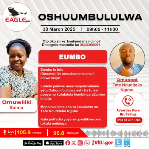 Oshipopiwa: Eumbo Eumbo lo tete lOmumati ile Omushamane oha lidikwa kulye. Otwali twapopi noku yelitha kutya olye apumbiwa oku dhika egumbo lyo tango lOmumati ile omushamane. Mono twapopi kutya ohali tendwa tango ku hogona nenge ku Tate goye. Moku dhika noku li temana omulilo tango,,elalakano okukwa takanitha kumwe naakwamungu mboka yeli pehala mpoka tolala. Okwali […]