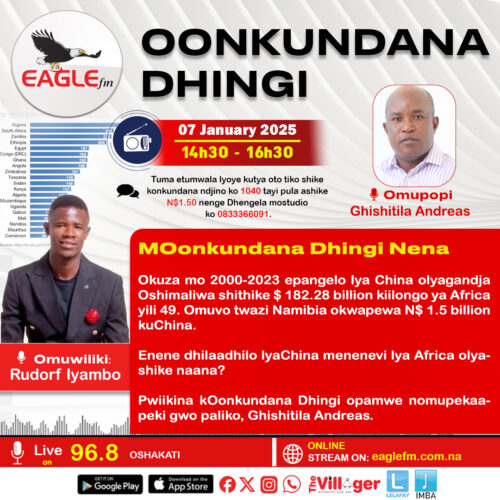 Okuza mo 2000-2023 epangelo lya China olyagandja Oshimaliwa shithike $ 182.28 billion kiilongo ya Africa yili 49. Omuvo twazi Namibia okwapewa N$ 1.5 billion kuChina. Enene dhilaadhilo lyaChina menenevi lya Africa olyashike naana? Pwiikina kOonkundana Dhingi opamwe nomupekaapeki gwo paliko, Ghishitila Andreas.