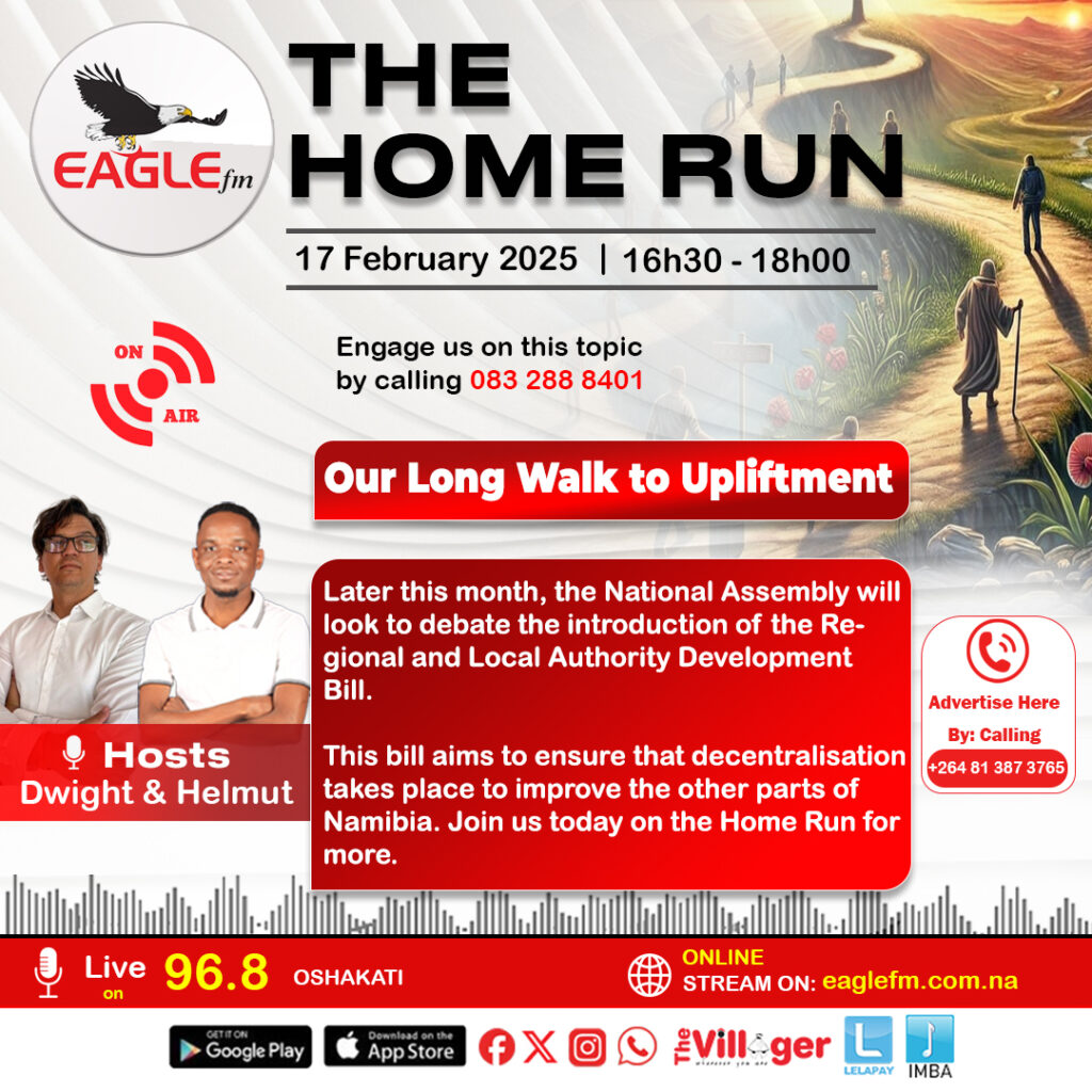 Our Long Walk to Upliftment Later this month, the National Assembly will look to debate the introduction of the Regional and Local Authority Development Bill. This bill aims to ensure that decentralisation takes place to improve the other parts of Namibia. Join us today on the Home Run for more.