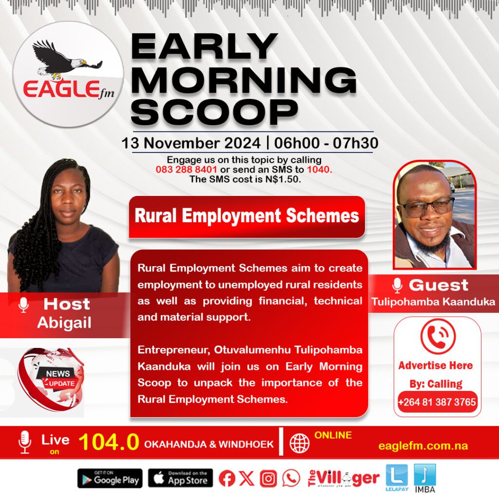 In today’s early morning scoop, we spoke to the founder and advocate for rural economy Tulipohamba Kaanduka who lamented on rural employment schemes initiatives. Kaanduka runs a piggery start-up in northern Namibia indicated that the schemes are poorly implemented with little impact on rural communities. we also covered the importance of internship programs in the country as well as the Namibian police who hosted a workshop on women executive leadership and knowledge management to empower women leaders, deepen collaborative networks and explore solutions.