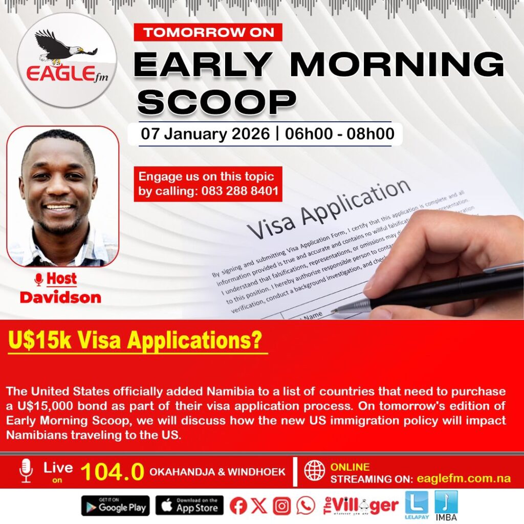 THE EARLY MORNING SCOOP WITH DAVID (7 JANUARY 2026) 7th January 2026 / EAGLE FM On EMS, we defined what a visa bond is and how new US immigration policy impact Namibians traveling to the US.