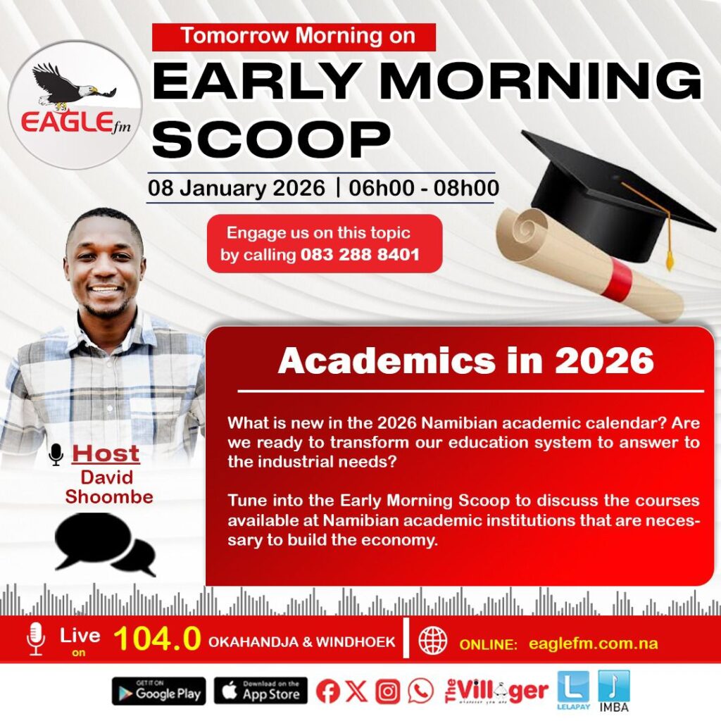 THE EARLY MORNING SCOOP WITH DAVID (8 JANUARY 2026) 8th January 2026 / EAGLE FM Tracking the alignment of Namibia education system with the market needs. (Energy Institute at NUST), new course on water resources management at IUM and addional course at other institutions)