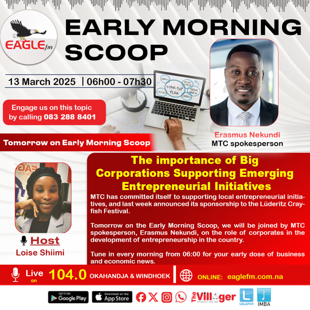 THE EARLY MORNING SCOOP WITH LOISE (13 MARCH 2025) 13th March 2025 / EAGLE FM 1.We spoke to MTC PRO Erasmus Nekundi about the sponsorship of the 2025 crayfish festival. 2.We engaged with officials from the education sector on the upcoming budget allocation in the head of the new president will be in
