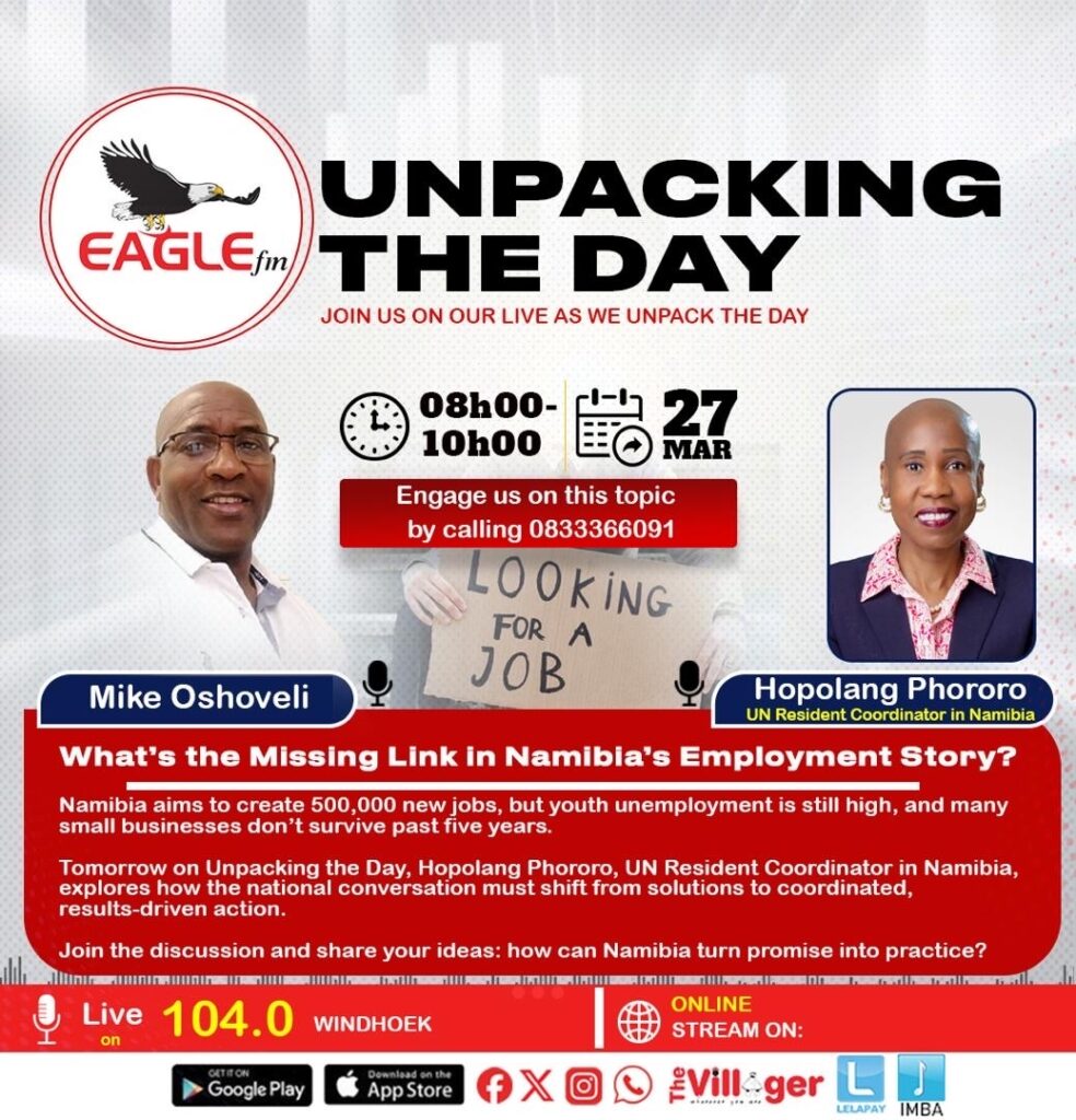 UNPACKING THE DAY WITH MIKE (27 MARCH 2026) 27th March 2026 / EAGLE FM 1. MOHSS back in business with ‘middlemen’ 2. What is the missing link in Namibia’s employment story, interviewed Mrs. Hopolang Phororo, UN Resident Coordinator in Namibia