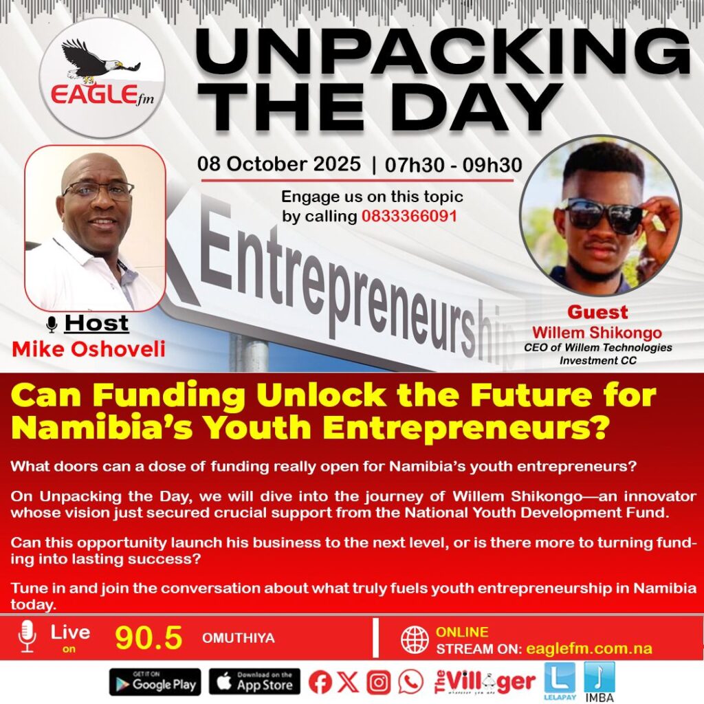 UNPACKING THE DAY WITH WILLEM SHIKONGO (08 OCTOBER 2025) 8th October 2025 / EAGLE FM Can Funding Unlock the Future for Namibia’s Youth Entrepreneurs, Interviewed Willem Shikongo, CEO – Willem Investment CC.